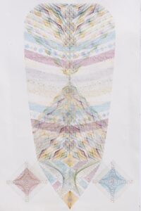 My work in thread, watercolor and colored pencil on paper attempts to explore some aspect of existence that is beyond the sense of being an individual, it reaches for something collective, synthesizing and cohering disparate parts, massing stardust. Beyond capturing a single moment, this work seek to bridge time and expand an understanding of the present.